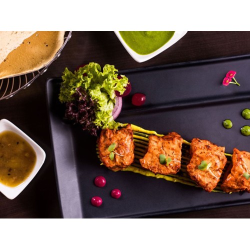 Mildly flavoured grilled cottage cheese marinated with fresh cream, cashew paste, herbs and aromatic spices. Served with fresh mint chutney